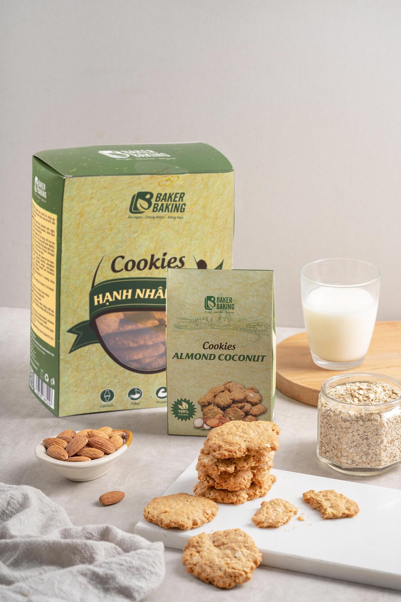 BÁNH COOKIES HẠNH NHÂN DỪA BAKER BAKING Đóng gói: hộp 100gr, 500gr Bánh quy hạnh nhân dừa bổ sung nhiều chất dinh dưỡng cho cơ thể