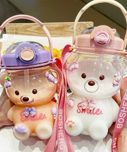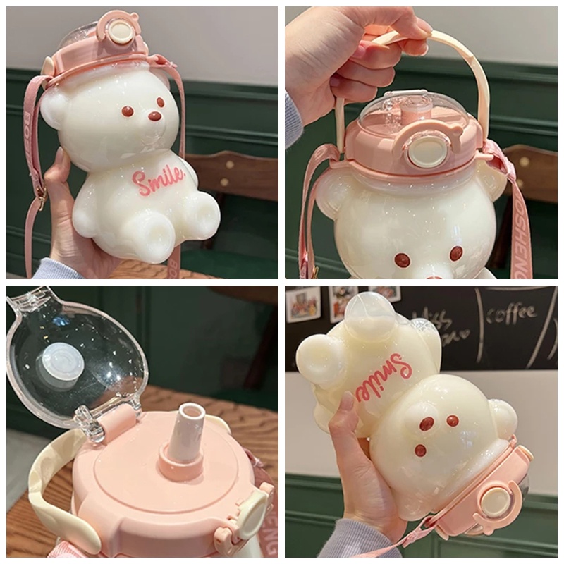 Bình Nước Hình Gấu Kèm Ống Hút Dây Đeo Dễ Thương 1100ml
