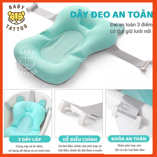 Sản phẩm đệm lót bồn tắm Baby Tattoo chống trượt, mềm mại, an toàn cho bé sơ sinh được làm từ những loại chất liệu cao cấp và an toàn. Bao gồm: Lớp vải cao cấp, mềm mại ở phần trên, vải lưới hình dạng 3D mặt dưới, dây đai làm từ vải dù và khóa nhựa dẻo dai, bền bỉ.