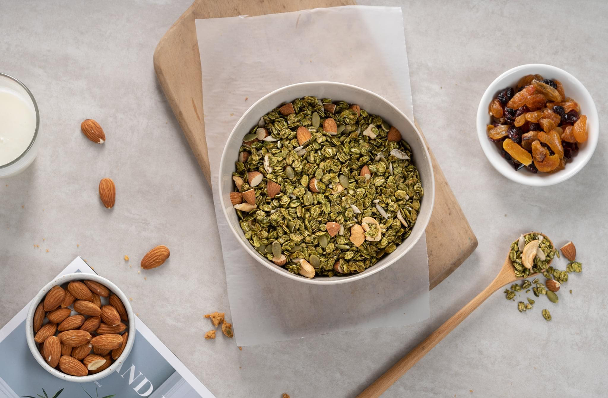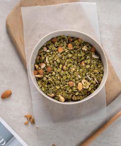 Thành phần: Hạt bí, hạt hướng dương, yến mạch, hạt hạnh nhân, hạt bí Ấn độ, Nho khô, Nam Việt quất, hoa quả sấy dẻo, bột quế, Vani/ trà xanh/ cacao