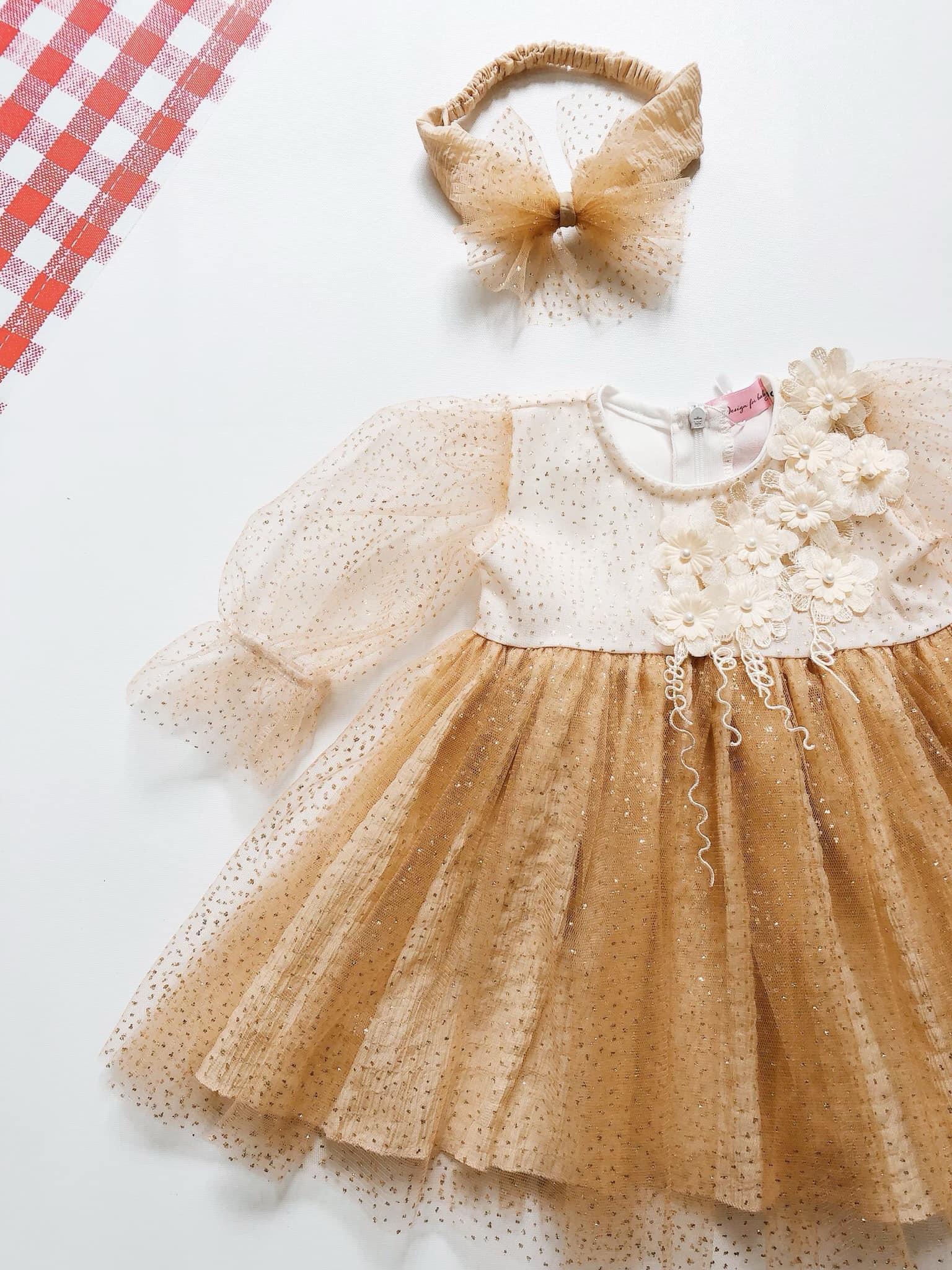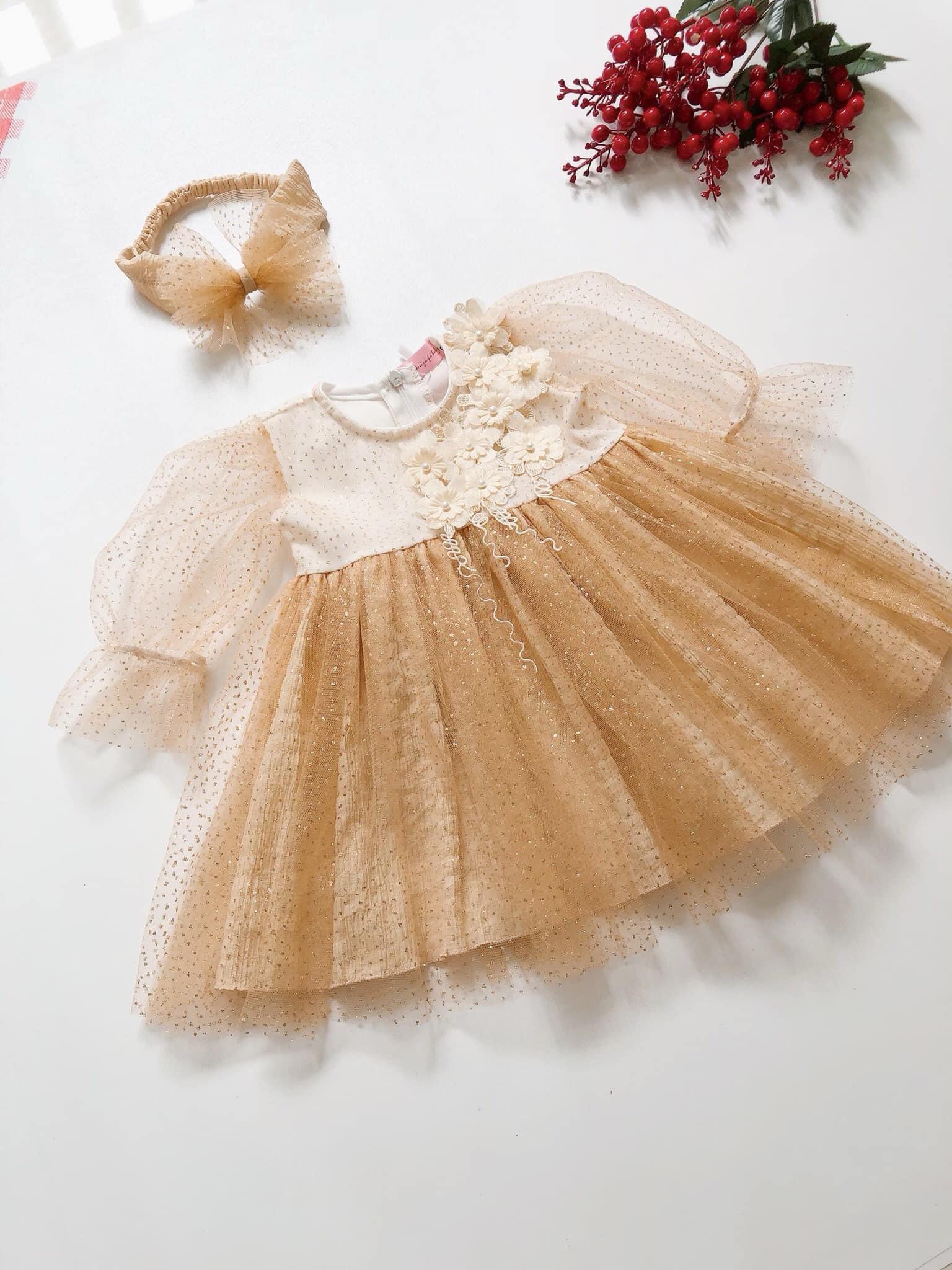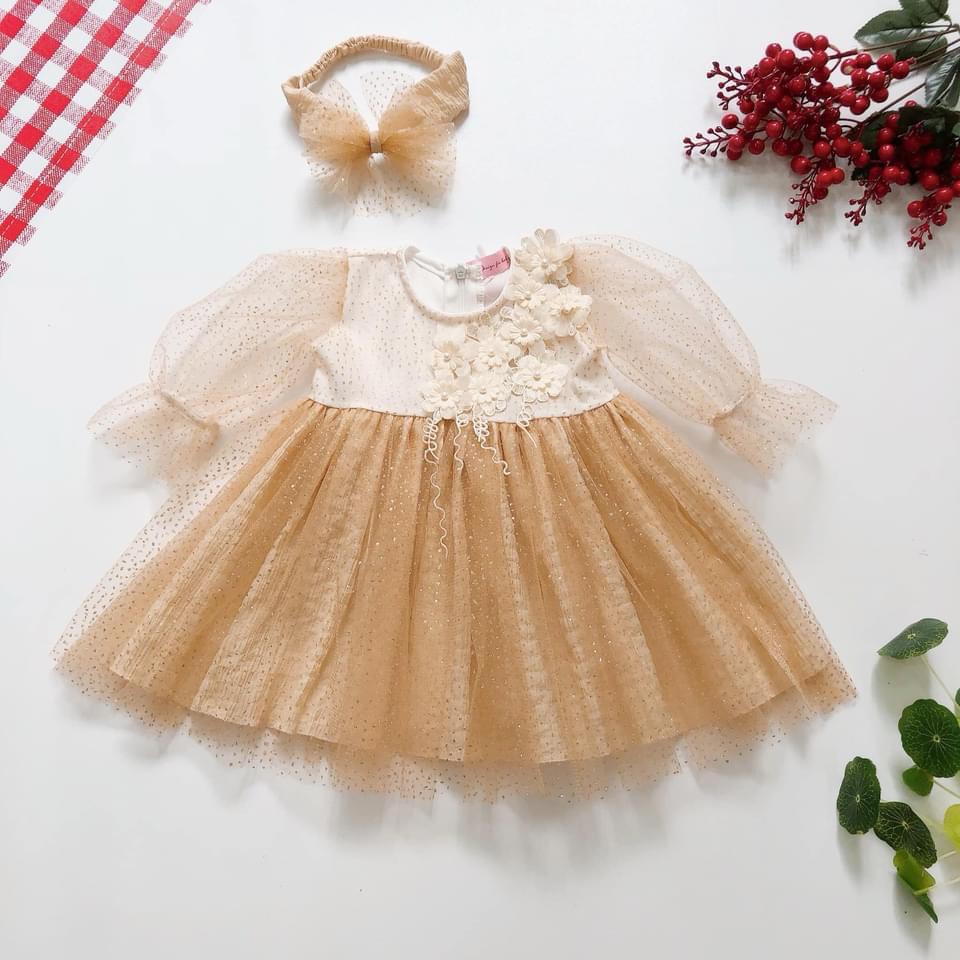 Váy công chúa đính hoa ngực phối lưới kim tuyến tạo độ bồng xoè xinh xắn cho bé yêu